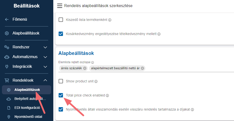 Annyi teendőnk van, hogy a Beállítások/Rendelések/Alapbeállítások menüben kapcsoljuk be a Rendelés tételeinek ellenőrzése jelölőnégyzetet.