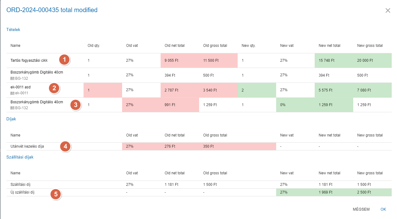 Ekkor ha a már meglévő rendelésen módosítunk a tételek árain vagy magukon a tételeken, díjakon valamit, akkor mentés után a rendszer megjelenít egy ellenőrző ablakot, amiben látható külön tételekre, díjakra és szállítási díjakra bontva a régi mennyiség, áfa, nettó ár, bruttó ár, mennyiség és ugyan így az új mennyiség, áfa, nettó ár, bruttó ár.
